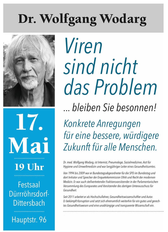 Vortrag von Dr. Wolfgang Wodarg zum Thema "Viren sind nicht das Problem - bleiben Sie besonnen!" Konkrete Anregungen für eine bessere, würdigere Zukunft für alle Menschen. Der Vortrag findet am 17. Mai um 19 Uhr bei Pirna statt.